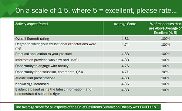 “This summit has been the best obesity conference I’ve ever attended. The fact that the faculty members of this caliber were available lecturing was outstanding. The small group feel was also wonderful. The quality of the talks and break out sessions was wonderful. Next year I will not only come back but bring every resident in my program. This is a MUST for family medicine physicians. Period.”